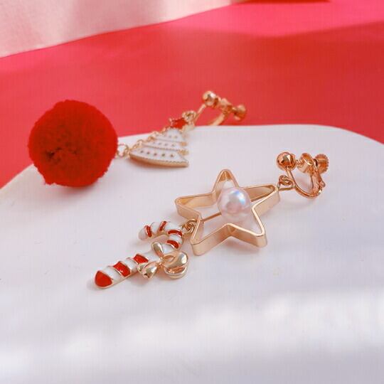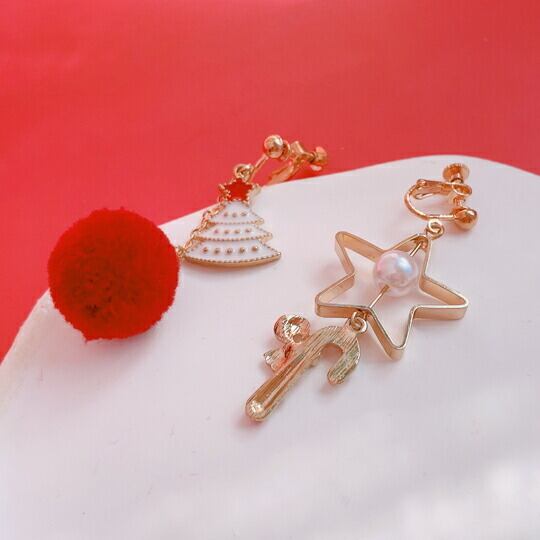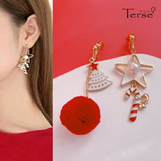 Terse ホワイトクリスマスからインスピレーションを得た存在感のある白いクリスマスツリー&スターイヤリング かわいい女の子らしいふわふわなクリスマス色ゆらゆら赤ポンポン付き 左右非対称 ノンホール 可愛いいキャンディケインモチーフ プレゼントse0316a