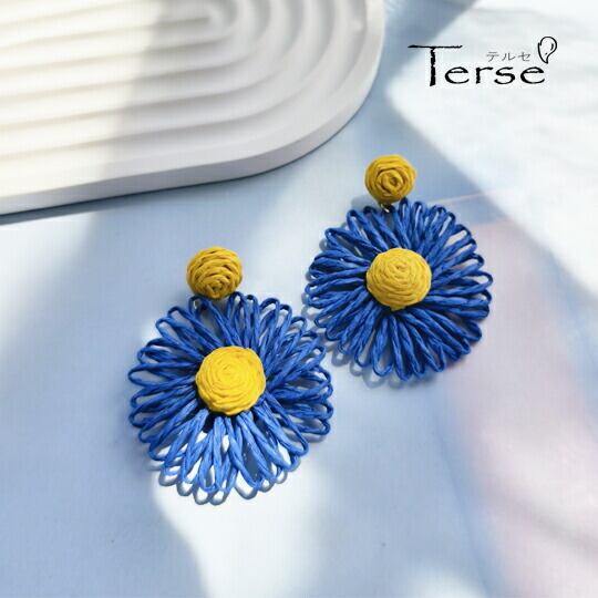 Terse 夏にぴったり 草編み模様の大振りピアス 鮮やかなブルーとイエローのコントラストが目を引き、リゾート感を演出し 涼しげな印象を与える繊細な編み込みデザインで、暑い季節でも快適に過ごせ サイズ感が存在感を放ち、シンプルな装いにも華やかさをプラス se0342a