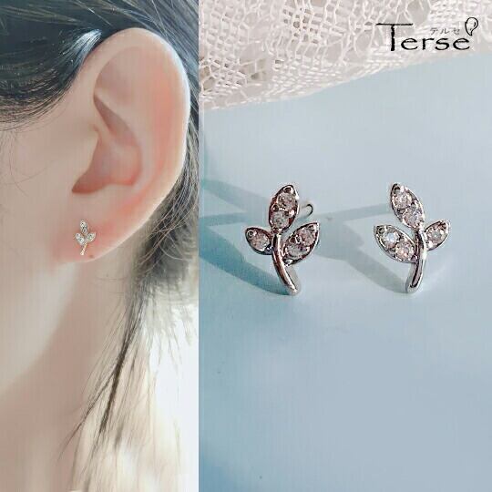 Terse CZダイヤモンドを贅沢に埋め込めた繊細なオリーブ葉を象ったスタッドピアス 優しい雰囲気の葉っぱモチーフが、エレガントな耳もとを演出 ナチュラル感たっぷりの、女性らしいアクセサリー リーフ ボタニカル ミニピアス 小さいぶり オンオフ問わず sp0224as