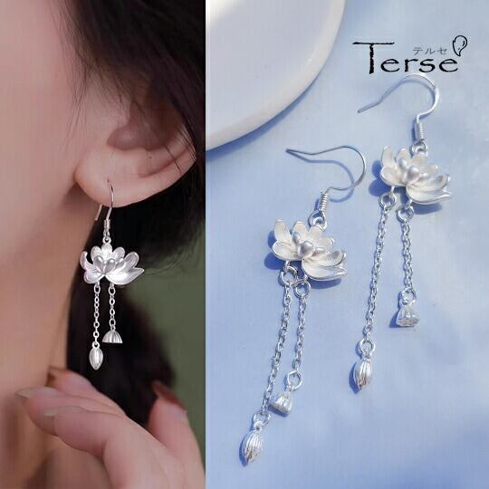 Terse 蓮の花シルバー925チェーンピアス 繊細蓮の花が主役で、チェーンがさりげなく垂れ下がり蕾と蓮の花托が、自然の美を象徴 動くたびにキラキラと光を反射し、視線を引きつけます どんな服装にもマッチしエレガントなイブニングドレスにぴったりで7月誕生花sp0240a