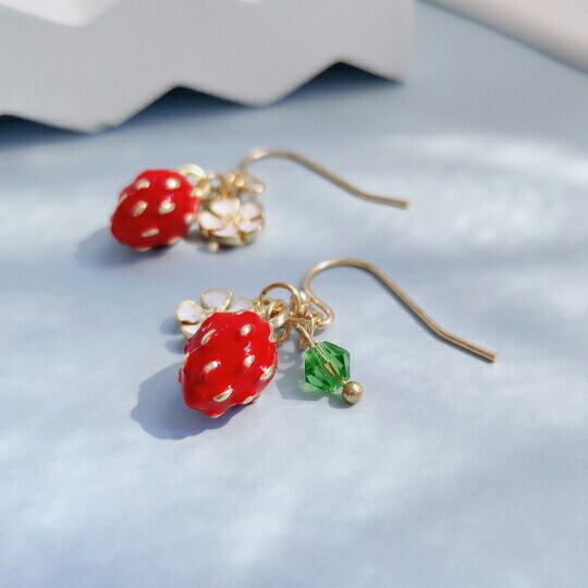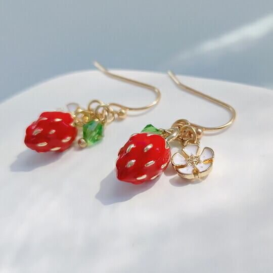 Terse 可愛らしい赤いいちごと白い苺の花をモチーフにしたデザインのフープピアス エナメル加工が施された立体的ないちごが、耳元に華やかさをプラス 細部まで丁寧に作り込まれたこのピアスは、秋冬のコーディネートにアクセントを加え、女性らしさを引き立てsp0242a