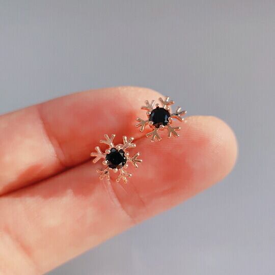 Leafy☆キラキラ一粒ジルコニアピアス☆CZ雪の結晶☆ピンクゴールド/ブラック(pink gold/black stone) これからの季節に♪クリスマスやパーティにも♪デートや女子会に♪エレガントで高貴な輝きを耳元に♪☆アナと雪の女王