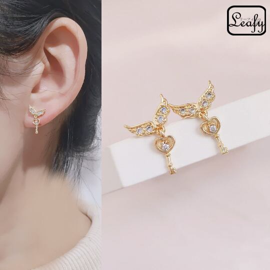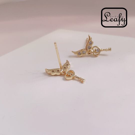 Leafyリーフィ 幸せを招く天使の翼とハートの鍵モチーフピアス 1ペア 動くたびに耳元でハートのキーが可愛く揺れます レディース プレゼント 普段使い お出かけ パーティー エンジェル ウィング 羽 キー S925ポスト ゴールド gold x09064ag