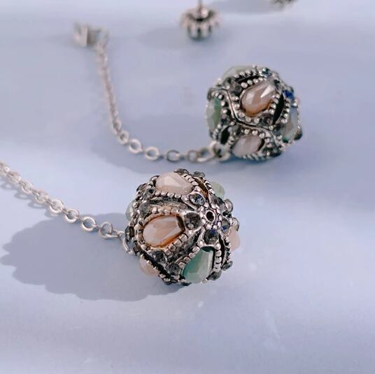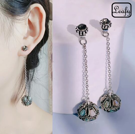 Leafy ピアス 1ペア レディース 2way グリーン ビジューボール ロング チェーン アンティーク調 ラウンドシェイプ スウィング 小顔効果 エレガント シック 神秘的 お出かけ イベント デート 結婚式 二次会 お呼ばれ パーティー 普段使い プレゼント x09118agr