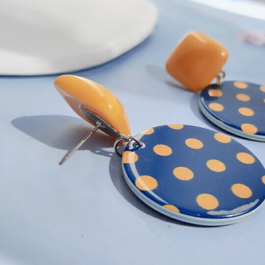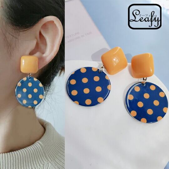 Leafy レトロだけどおしゃれ!ブルー&イエローのポップなドットピアス 1ペア レディース キュート 可愛い おしゃれ 水玉 スクエア ラウンド プレート プラスチック お出かけ イベント デート お呼ばれ パーティー 普段使い プレゼント 大振 x09222a