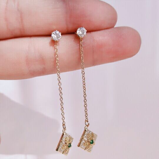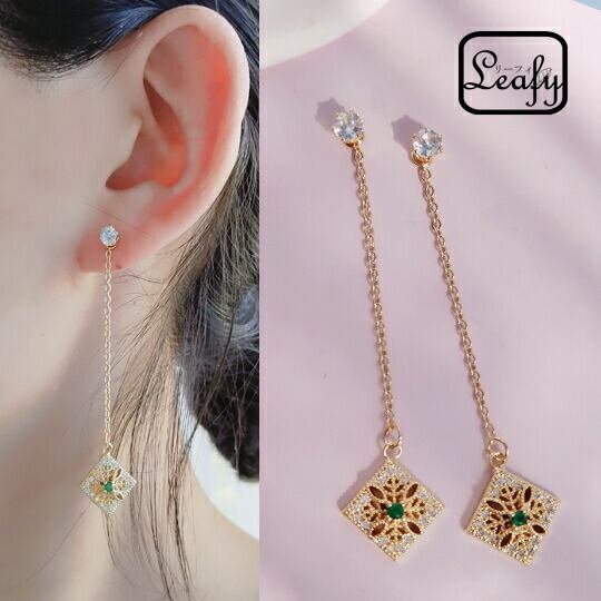 Leafy アラベスク模様が映える☆中央でエメラルドグリーンが光る細身ゴールドチェーンのロングピアス 1ペア レディース ジルコニア エレガント お洒落 幾何学 普段使い お出かけ パーティー イベント 食事会 女子会 デート プレゼントx09258a 5月誕生石
