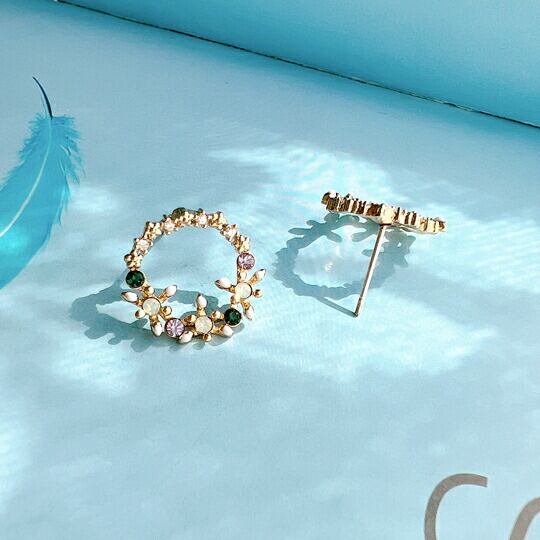 Leafy パープルとグリーンのビジューが輝く、花冠のような愛らしいジルコニアピアス 1ペア レディース 花輪 フワラーフープ エレガント 上品 大人かわいい お洒落 普段使い お出かけ パーティー イベント 食事会 女子会 デート 二次会 プレゼント x09322apu