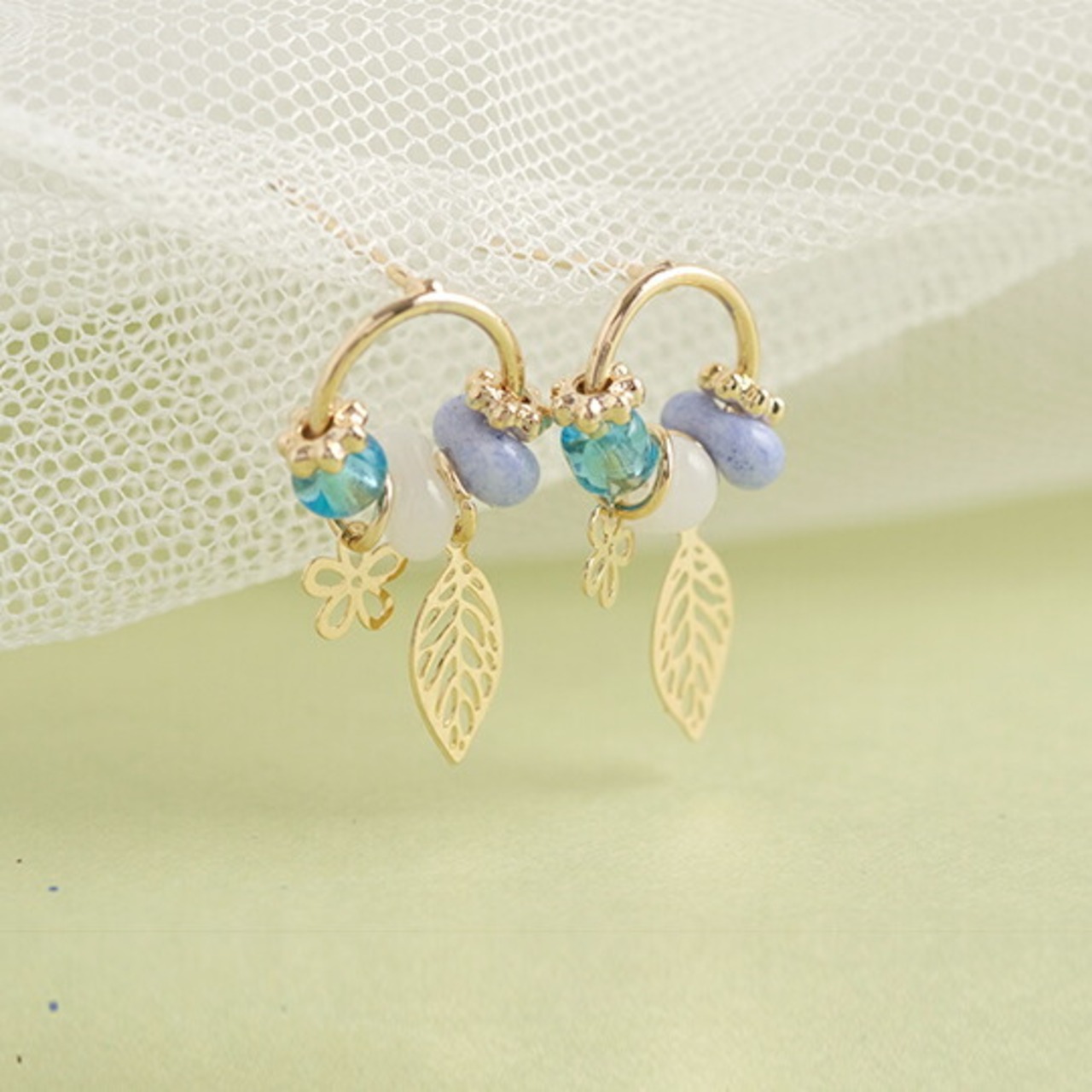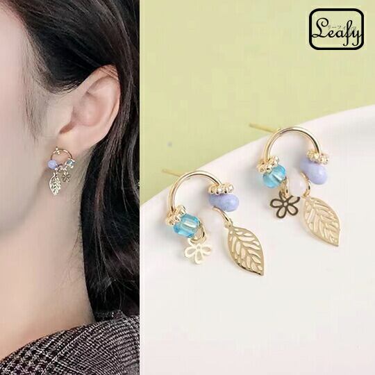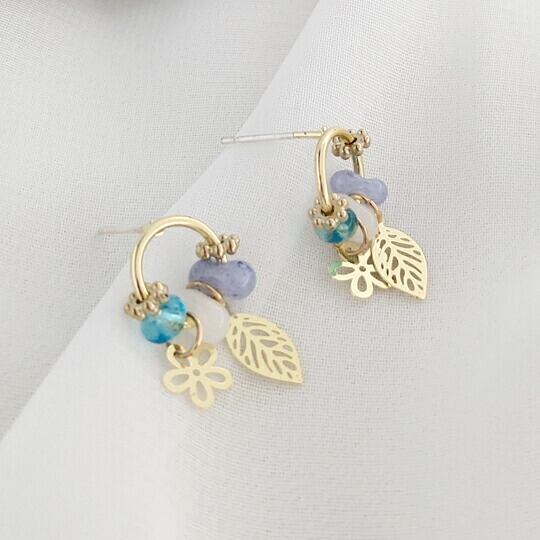 Leafy ならではの葉と花パーツ使いが可愛いビジューピアス 程よい大きさのリングにあしらわれた立体的なビーズ&リーフ フラワー が目をひきます 華やかな存在感があり、アップヘアの耳元におすすめのひと品 ブルー 普段使い お出かけ 二次会 春 x09363abl