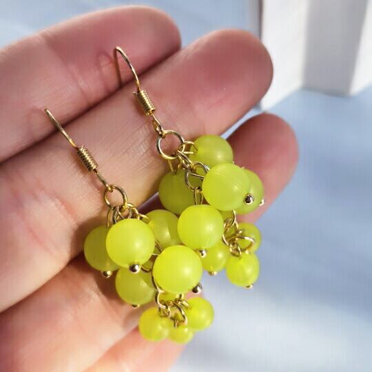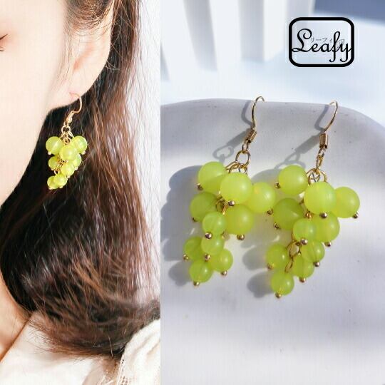 Leafy可愛いらしい光沢があるグリーンクリスタルビーズを使用し、葡萄の形に編んだフックピアス オーロラマットの美しい色合いのシャインマスカットモチーフ 耳飾り フルーツ ぶどう マスカット 普段使い カジュアル 人造水晶 レディース 秋 夏 アクセサリーx09370a