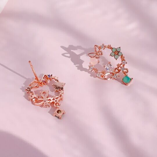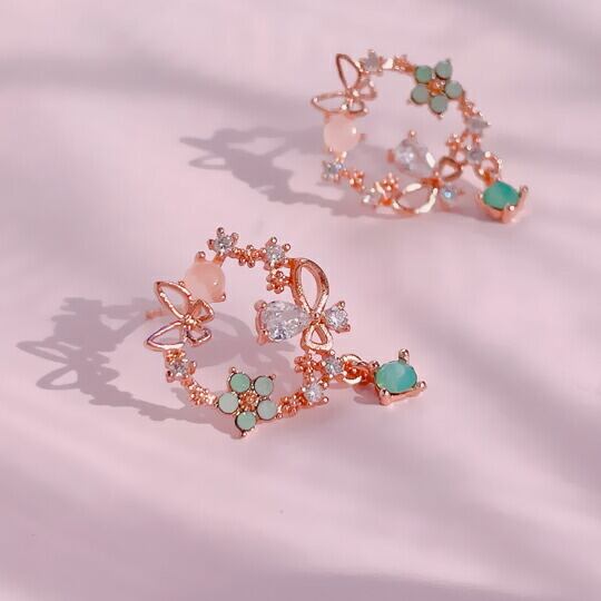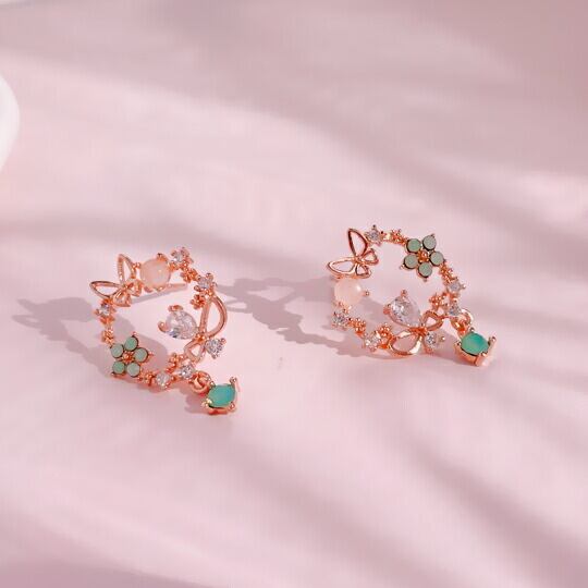 Leafy 細部まで美しく繊細 立体的な花にCZダイヤの蝶が舞う華やかなデザインのピアス カラーストーンがきらめいて美しく輝きを放つ、ボリュームたっぷりのモチーフ 顔まわりをゴージャスに彩る 眺めていて飽きないピアス 蝶々 フラワー ピンク 春 x09376agpk