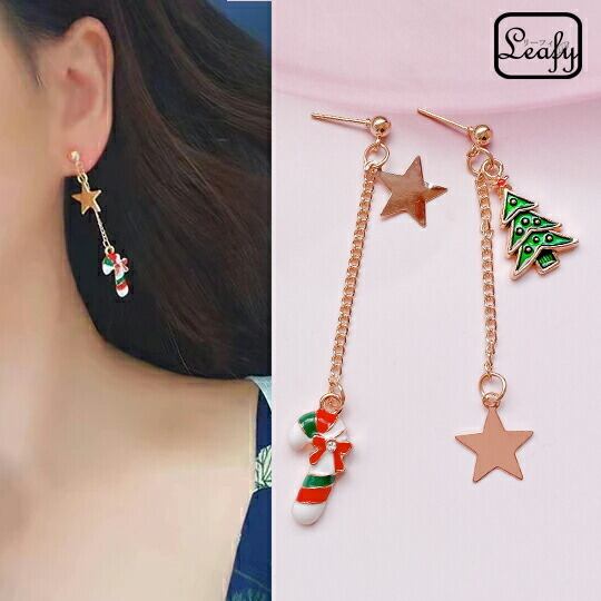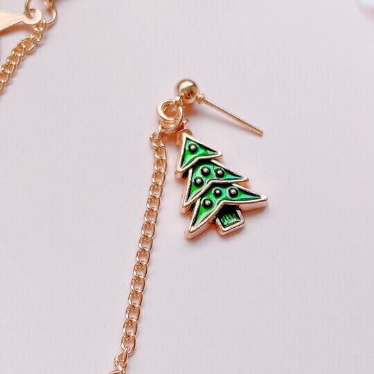 Leafy 可愛く華やかなクリスマスツリーとクリスマス スティック 左右非対称 飾りの星付き チェーンピアス クリスマス気分をじわじわと盛り上げていくHOLIDAYアクセサリー パーティー 忘年会 二次会 エナメル スター X'mas Theme x09382a