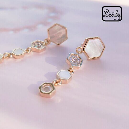 LeafyハニカムをイメージするCZダイヤ&白蝶貝6連六角形 程よい存在感と華奢加減のバランスがよく手放せない存在になりハニカムピアス 外出する際に気分をアップさせてくれるアクセサリーです お洒落 プレゼント お出かけ 上品 マザー オブ パール 本金メッキx09410ag