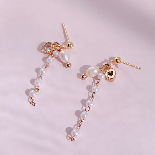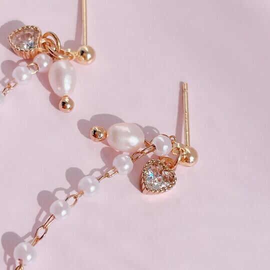 Leafy 揺れるロングパールチェーンピアス 淡水パール パールが5つ連なっていて 繊細なチェーンがエレガント ミル打ち ジルキュービックジルコニアハート デイリーにも これからのホリデーシーズンにも活躍してくれそう プレゼント 冠婚葬祭 入園式 x09416a