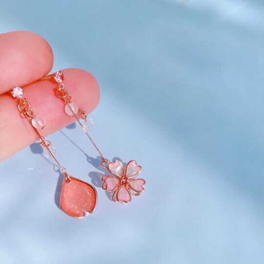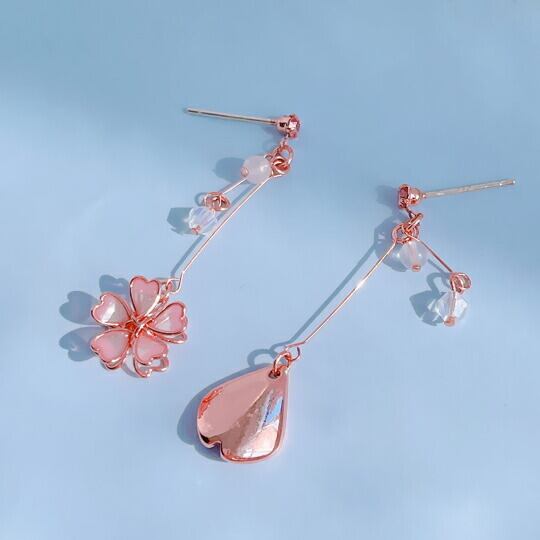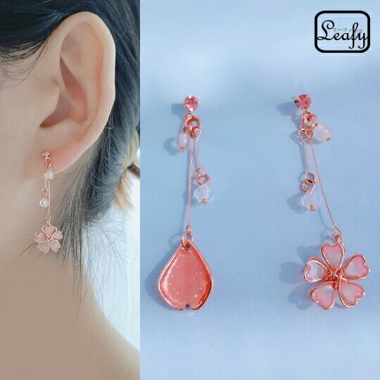 Leafy 飴細工のような透明感のある、透明の淡いピンク桜&花びらモチーフピアス 瑞々しい質感に仕上がっております お肌に馴染むお色目ですので、お着物にも合わせて頂きやすい お花見 さくら 春 左右非対称 ゆらゆら チェーンピアス 上品 お洒落 x09422a