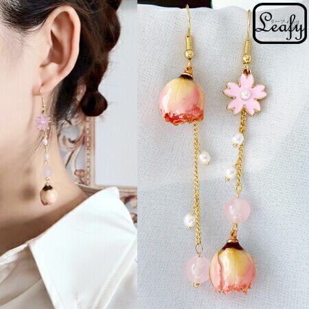 Leafy清楚で可憐な雰囲気で、人気の薔薇のつぼみチェーンピアス 蕾の色は 可愛らしいミルキーピンクのような色合い 長く垂れ下がるタイプので、蕾がゆらゆらとして、とても可愛らしい 配したベビーパールの艶がより一層上品さを醸し出します さくら 桜 x09428a11月誕生花
