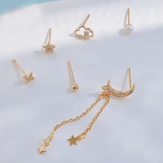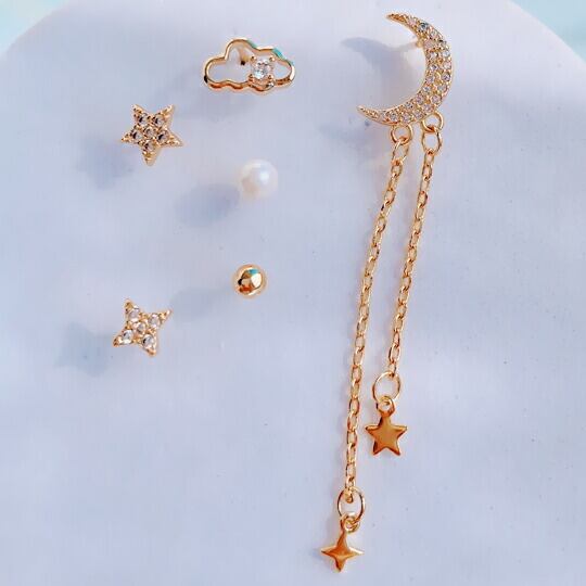 Leafy 耳元で輝く小さな三日月 星 雲などをモチーフしたミニピアス 夜空6点セット 週間 日替わり ボール スタッド パール ドロップ キュービックジルコニア セカンドピアス 大人 上品 華奢 シンプル デイリー使いやすいデザイン スター ムーン チェーン x09433a