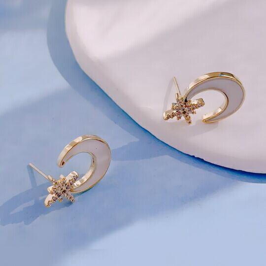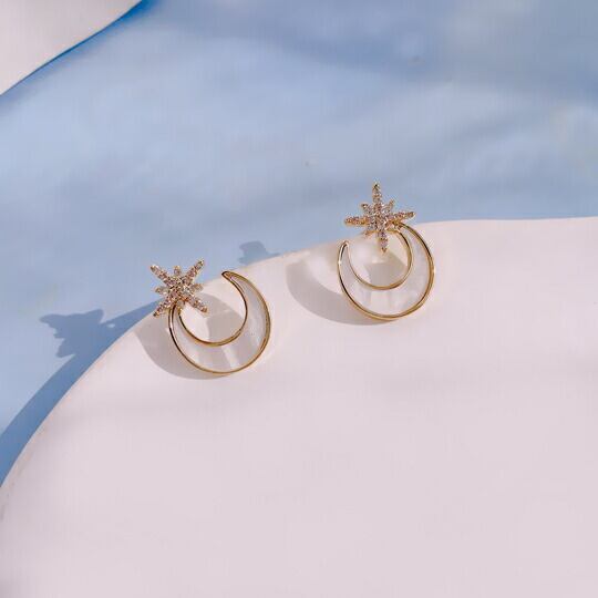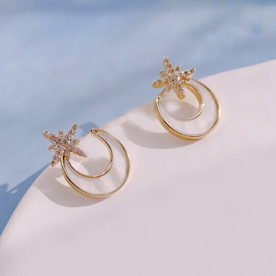 Leafy 三日月と、寄り添うキュービックジルコニア南十字星のかわいいピアス 乳白色の優しい色味で、独特の反射が魅力的、ムーンの美しく神秘的な雰囲気を表現するのにぴったり オンオフ問わずご使用いただけるアイテム ギフトx09490a