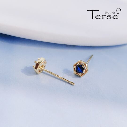 Leafy 小さいな一粒CZダイヤでエレガントなスタッドピアス サファイア色キュービックとゴールド色金属のコントラストが美しく、華やかさと上品さで耳元を飾り デイリーに オフィス カジュアルに お呼ばれなどのフォーマルにも使える x09504a
