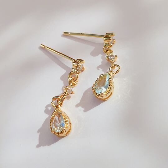 Leafy ラウンドカットクリアCZとペアシェイプカットライトブルーCZがきらめくデザインのピアス 石のまわりのミル打ち さりげなく輝かせるデザインを出しており お顏周りをより華やかに そして上品に見せてくれる仕様となっており、おしゃれにも非常に使いやすい x09509ag
