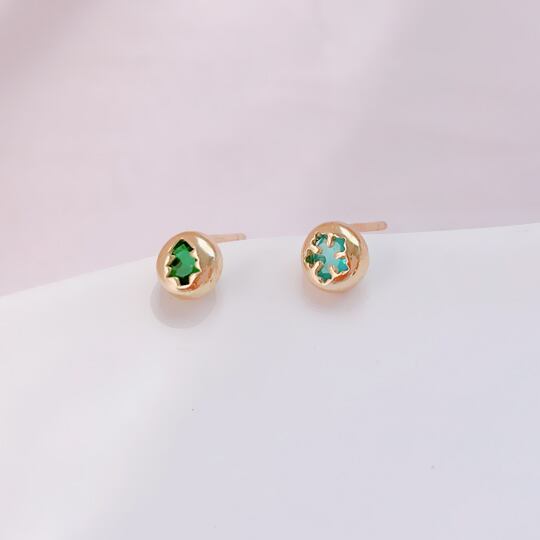 Leafy円形フォルムの中に閉じ込めたアクアブルーとエメラルドグリーンの2石のキュービックジルコニアがクリスマスツリーと雪の結晶モチーフピアス 立体感がありながら軽い、ボリューム感が目を引く素敵なピアス 一粒 小さいぶり CZダイヤ クリスマス限定 x09515a