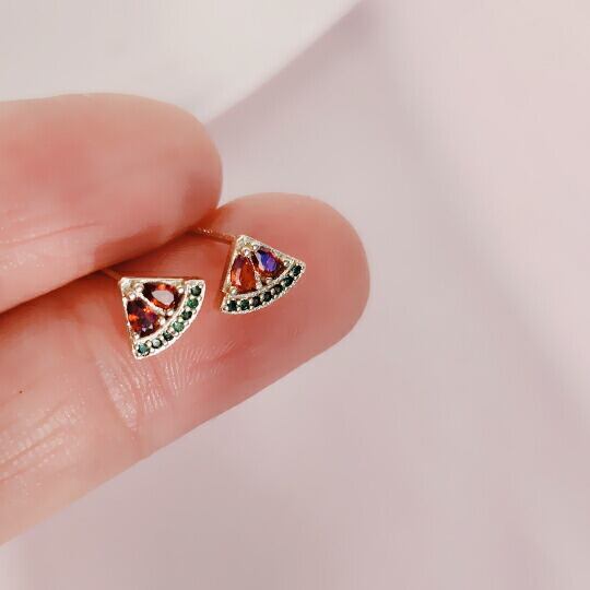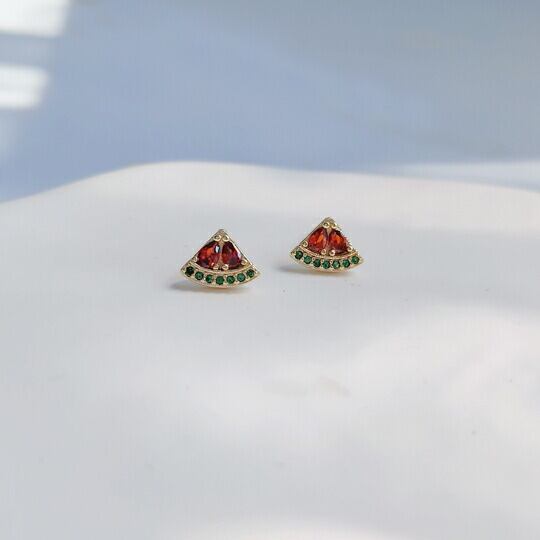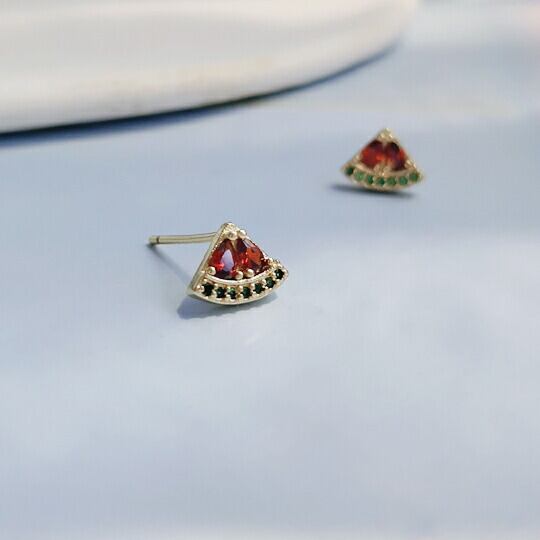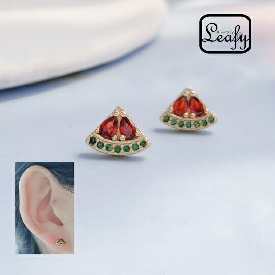 Leafy 夏の装いにぴったりな、西瓜をモチーフにしたミニピアス 鮮やかな赤色のCZダイヤが西瓜の果肉を表現し、周囲を囲む緑色の石は西瓜の皮をイメージしています 夏の日差しの下で特に美しく輝き、視線を引きつけるアクセントになることでしょう 果物 フルーツ x09544ag