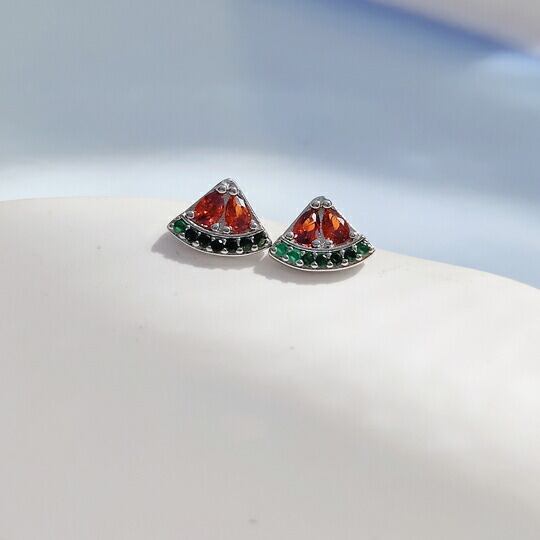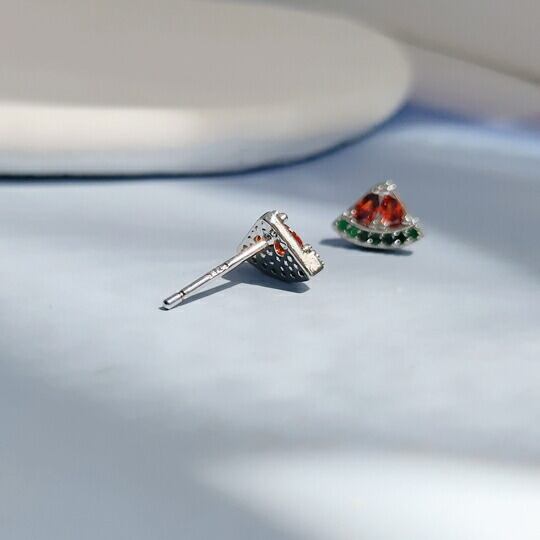 Leafy 夏の装いにぴったりな、西瓜をモチーフにしたミニピアス 鮮やかな赤色のCZダイヤが西瓜の果肉を表現し、周囲を囲む緑色の石は西瓜の皮をイメージしています 夏の日差しの下で特に美しく輝き、視線を引きつけるアクセントになることでしょうフルーツ x09544as