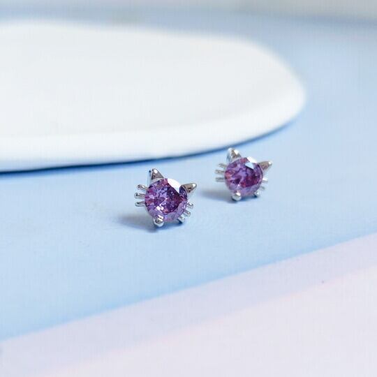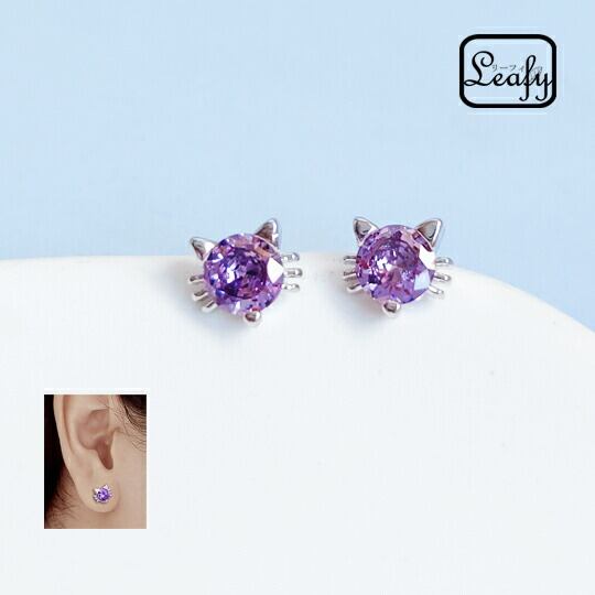 Leafy 仔猫の形をしたデザイン一粒のCZダイヤピアス 鮮やかな紫色で目を引き、猫の耳と顔の形が愛らしさを演出 シンプルながらも個性的なこのアクセサリー 日常使いはもちろん、特別な日の装いにもぴったり さりげなく個性を主張したい方におすすめ ねこ大好き x09557a