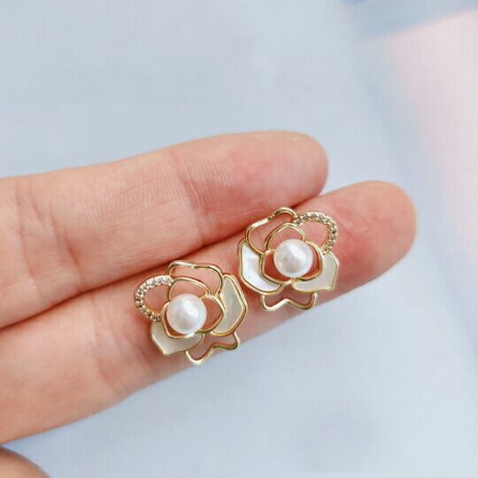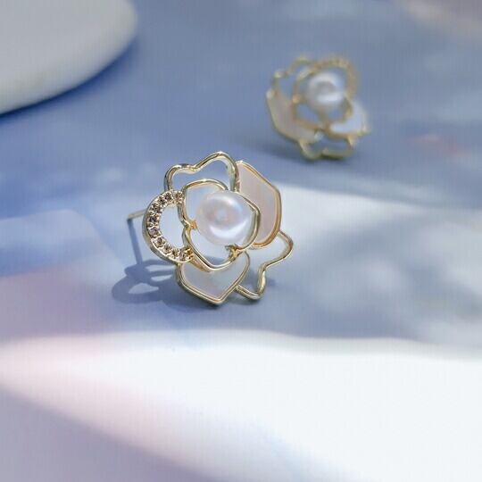 Leafy 洗練されたデザインと上品な輝きを兼ね備えた白蝶貝透かしバラパールピアス 金色の枠が透かしバラのデザインを引き立て、耳元で上品に輝く 白蝶貝の自然な光沢とパールの柔らかな輝きが、どんな装いにも洗練された印象を与えシンプルながらも存在感のある x09558a