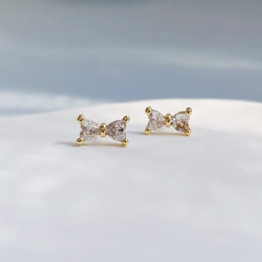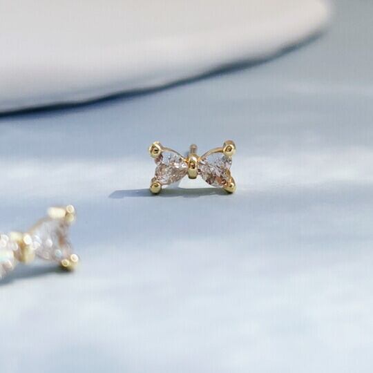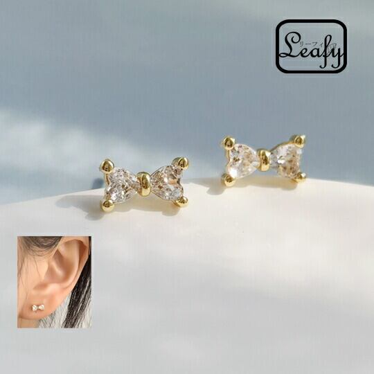 Leafy キラキラとした輝きを放ち透明度の高いCZダイヤミニリボンピアス 小さくて可愛らしいデザインが特徴で、どんなシーンにも合わせやすいスタッドピアス 上品なリボンの形状が耳元を華やかに演出し、日常使いから特別な日まで幅広く活躍 小さいぶりのお結び x09567a