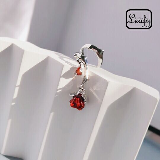 Leafy新作 愛と美、情熱を象徴する赤いバラをモチーフにしたイヤカフ ノンホールタイプで、ピアスの穴がなくても気軽に装着でき ルビー色のキュービックジルコニアのドロップチャームが、華やかさを一層引き立て、耳元に上品な輝きを添え バレンタイン x09576a
