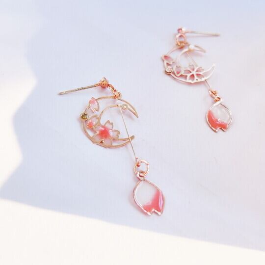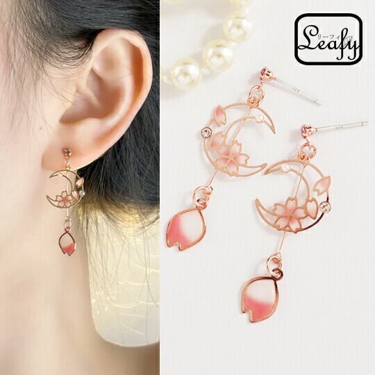 Leafy透明感のある飴細工のような美しさを持つ咲き誇る桜の花びらが三日月と共にゆらゆらと揺れるピアス 桜吹雪を思わせる繊細なデザインは、耳元に春の訪れを感じさせます 軽やかで優雅な印象を与えるこのアクセサリーは、特別な日のおしゃれにぴったり x09587a