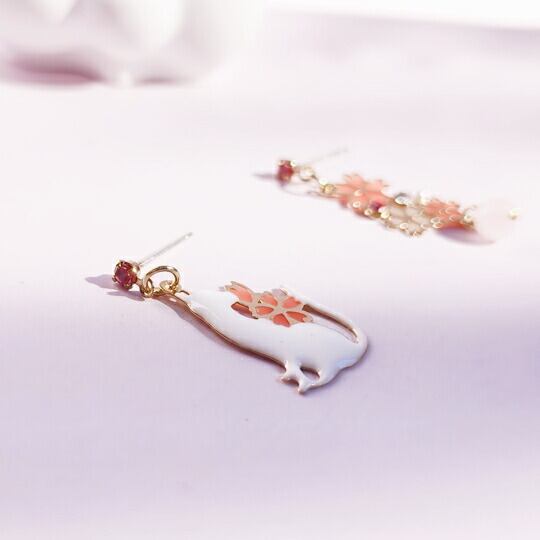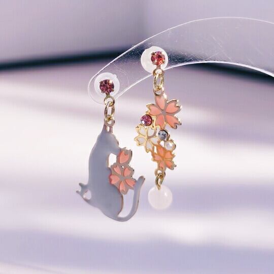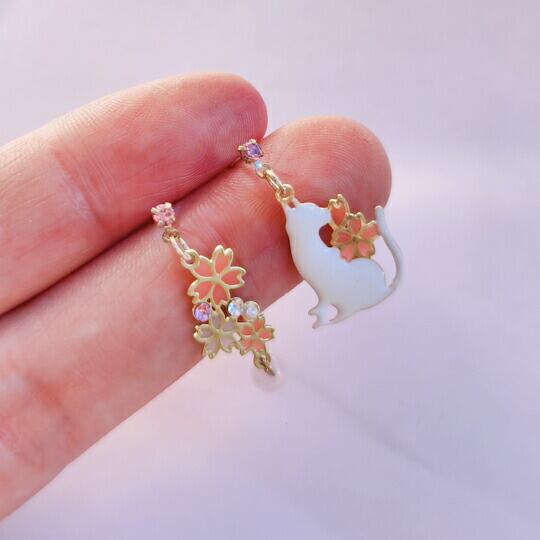 Leafy 桜の花と猫のアシストピアス 透かし彫りの技術で表現された桜の花びらは、まるで飴細工のような透明感を持ち、光を受けて美しく輝き 白い仔猫が静かに座る姿は、晴れた桜の木の下での穏やかなひとときを思わせます 春の優雅さと静けさを耳元に届けます x09588awh