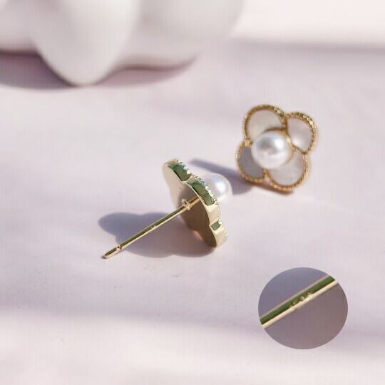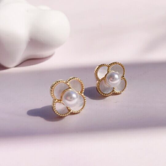 Leafy 洗練されたレトロな雰囲気を持つフラワーピアス 4枚の白蝶貝の花びらが優雅に配置され、中央には上品なパールが輝き 縁にはミル打ちが施され、細部にまでこだわったデザイン 日常の装いに優しさと洗練を加え、特別なシーンでもその存在感を発揮します x09595a