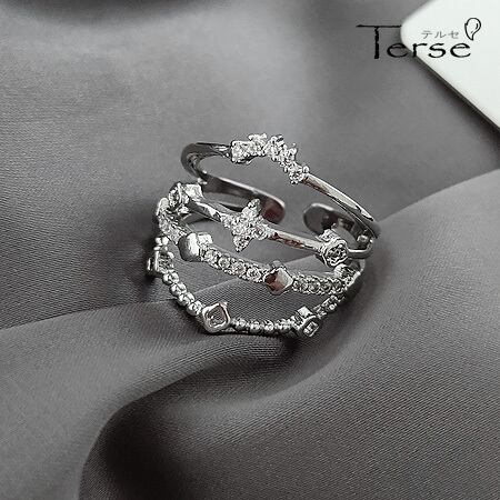 Terse 華やかで可憐なきらめきフォークリング 4連のラインに、照りの良い上質なCZダイヤとクローバーをセットした指輪 ジュエルをミル打ち枠で囲み、クラシカルで大人かわいい雰囲気 繊細で透け感がきれいなボリュームあるデザイン プレゼント rs0241as