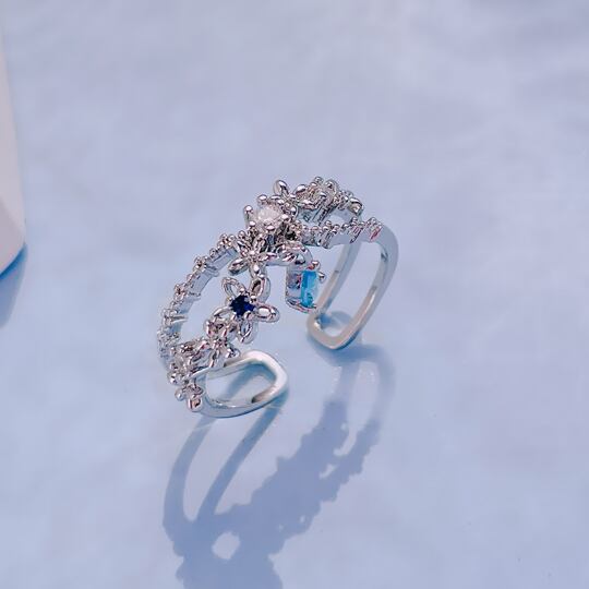 Terse サファイヤ色CZダイヤチャームがゆらゆら揺れて、輝きに動きのある可愛らしいリング さりげない仕草でキラリと大きく印象つける、女性らしさをさりげなくアピールできるクロスフラワー開け口指輪 主張しすぎずに、さりげな プレゼント ジルコニアrs0249as