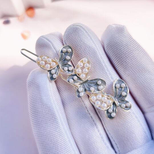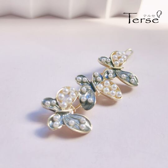 Terse春の風を感じさせるエナメル仕上げの蝶々が美しく舞うデザインのヘアピン 上品なグレーと白の色合いが、どんなスタイルにも優雅さをプラス ベビーパールがあしらわれたこのヘアアクセサリーは、特別な日にも日常使いにもぴったり洗練された印象を与え ha0174a