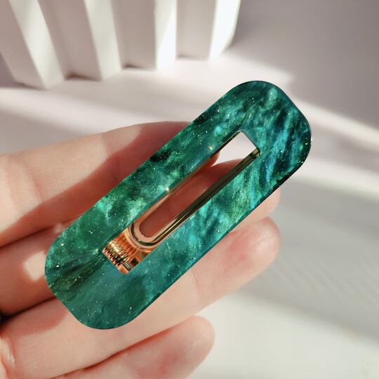 Terseアクリル素材を使用した青緑色のヘアクリップ サイドの髪を留めるだけで簡単におしゃれな印象を与え 大人かわいいデザインが特徴で、日常のスタイルにさりげないアクセントを加え 軽量で使いやすく、どんなシーンにも適します 髪をまとめるのに非常に便利 ha0168agr