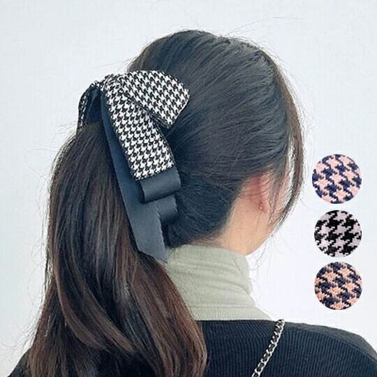 大人気の大きめリボンのバナナクリップ 千鳥格子柄のリボンが可愛い 大きめのリボンだからロングヘアにもバッチリ決まる存在感抜群のアクセサリー クリップにはリボンで装飾された 横から見てもキレイなデザイン どんなコーデにも相性良く、幅広く活躍 ha0159a | キラキラピアス