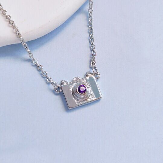 Terse ネックレス 可愛いカメラモチーフ レンズの部分がパープルストーンでキラキラ輝くキュートなデザインです♪普段使いにはもちろんお出かけにも◎さりげなく胸元を飾る、ほどよいサイズ感のキュートなカメラが女性らしさをUPしてくれます♪sn0013a