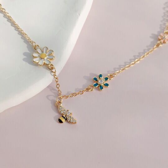 Terse 可愛いホワイトとブルーのお花に魅せられた小さなミツバチのブレスレット 鮮やかなエメラルドカラーと透明なCZダイヤをセッティング その姿はまるで太陽に照らされたフラワーガーデンのようです ミツバチはしあわせの香りをどこまでも運んでゆくのでしょう bl0103a
