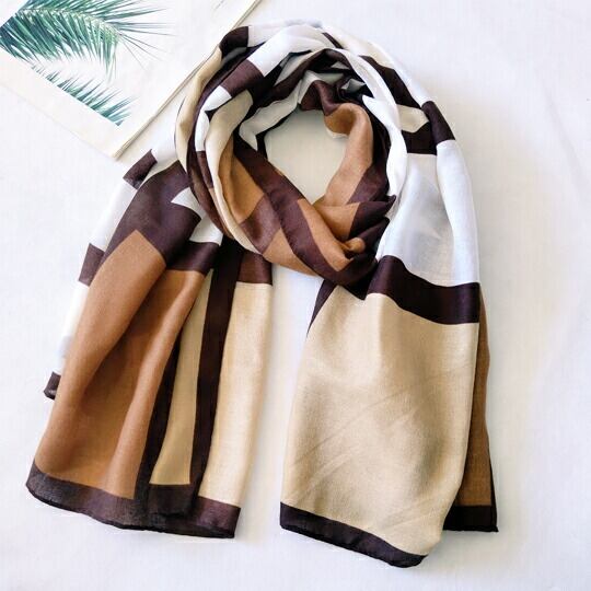 どんな色のアウターにも合わせやすくベージュとモカの色合いにダイナミックな幾何学模様の大判薄手ストール 肌触りが良く素材 季節を問わず快適にご使用できるのが魅力 どんな装いにも洗練された印象を加え シンプルながらも存在感を放ち春 秋 夏 ma0352abr