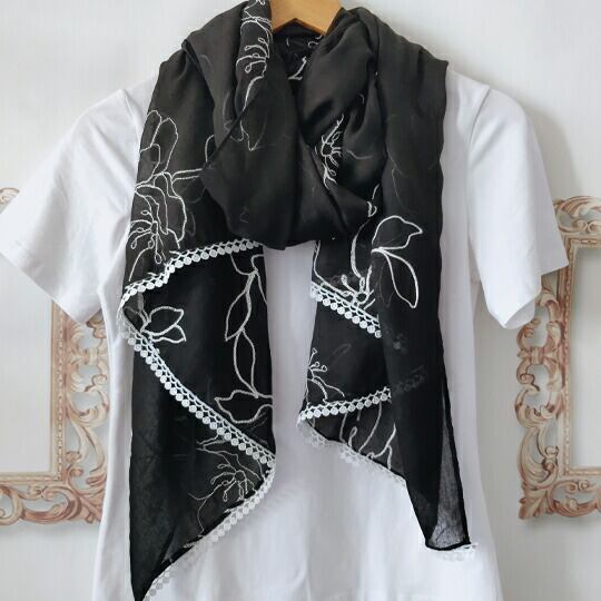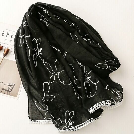 高貴な印象を与えるブラックカラーを基調にフラワー模様の刺繍が施された大判ストール アンティークな雰囲気を醸し出し、どんな装いにも上品さをプラス 着飾りすぎず、かといってシンプルすぎない自然体のコーデが特徴のナチュラルファッション ma0364abk