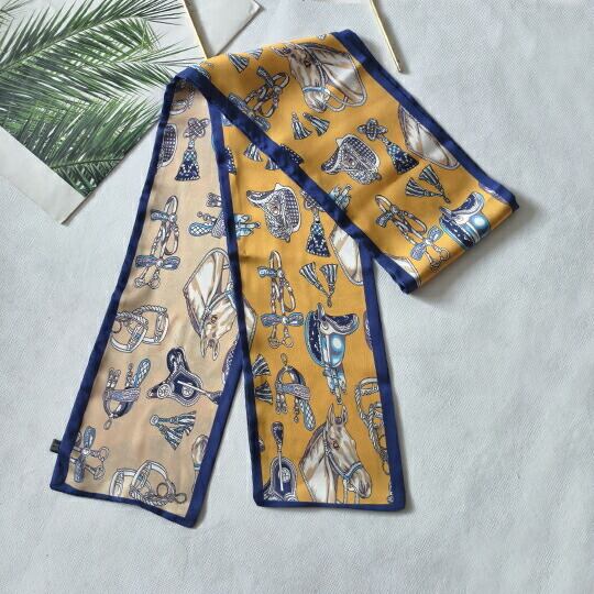 勝利や成功のシンボルである馬のリバーシブルスカーフ 馬と鞍のデザインが乗馬や馬術のエレガンスを感じさせます ネイビーの縁取りがオレンジとベージュの色合いを引き立て、洗練された印象を与え 細身のデザインは日常の装いに特別なアクセントを加えますma0389a