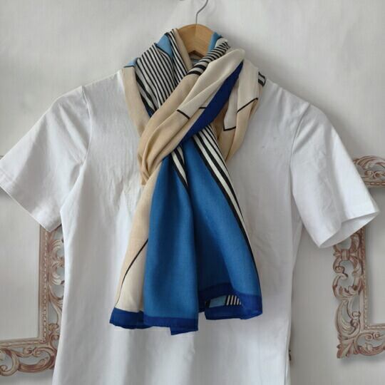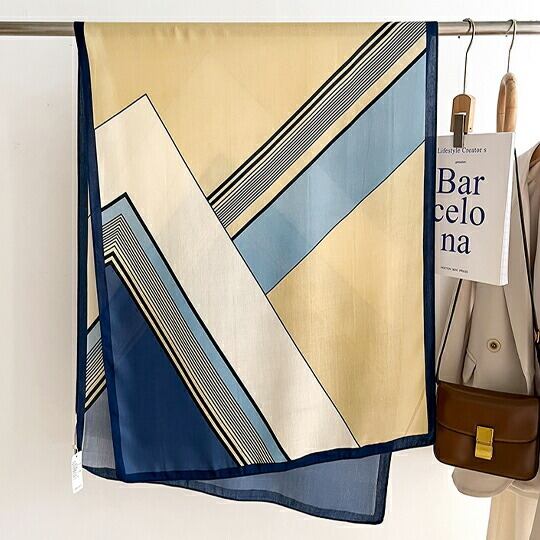 幾何学的な模様が特徴のスタイリッシュな大判ストール ブルー色とベージュの色合いが絶妙に組み合わさり シンプルな服装に合わせるだけで、洗練された印象を演出 日常のコーディネートにアクセントを加えたい方に最適で、季節を問わず活躍するアイテム ma0399abl