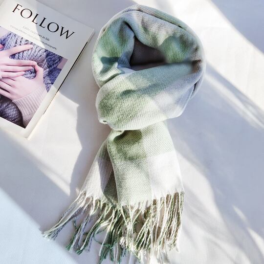 トレンドカラーを組み合わせたブロックチェック柄でインポートライクに仕上げしたマフラー 首に巻くのはもちろん、ショールとしてもお使いいただけます プチプラなのでスタイリングに合わせて何色か揃えるのもおすすめ ma0051algr 秋冬マフラー