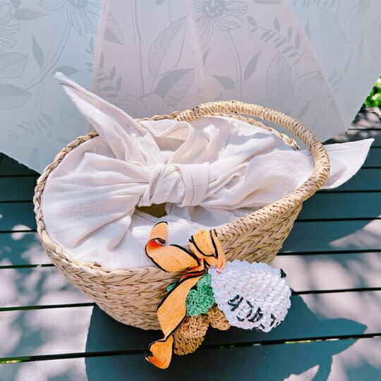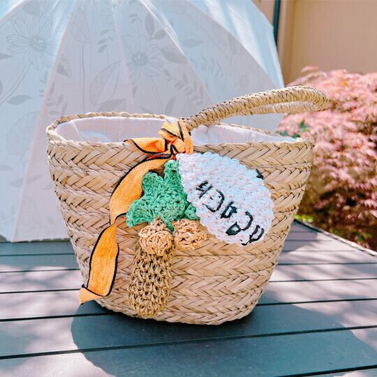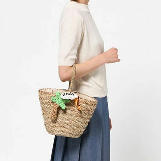 ヤシの木と白い雲チーフ付カゴバッグ 編みぐるみのモチーフが特徴的です 遊びのバッグとして、レジャーに海に持っていきたくなるようなアイテム コンパクトなサイズ キャセリーニ 籠バッグ 椰子 パームツリー ビーチ 海 トロピカル or0074ct