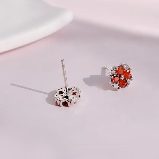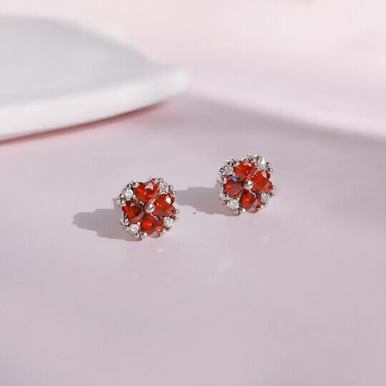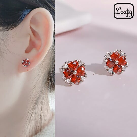 Leafy 綺麗なハート型の ルビー色CZダイヤ が四個 四つ葉のクローバーをデザインしたピアス チョット華やかな キュービックジルコニア レッド クローバーをCZダイヤで挟み 上品な 華やかなデザイン 赤 プレゼント 7月誕生石 ラッキーモチーフ x09402a Red