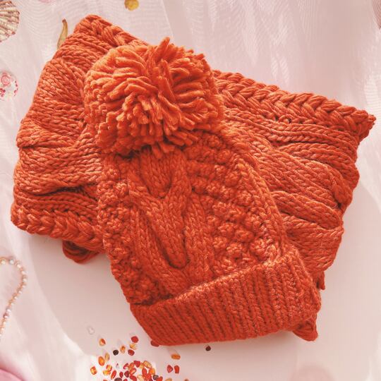 冬のコーデにまず間違いのない定番のケーブル編みボンボン付きニット帽&大判ストールセット ベーシックなアイテムですが、大きなファーボンボンがポイント オレンジ色でコーデの差し色に最適冬のコーディネートのアクセントに 単色なのでコーディネートしやすい ca0013a