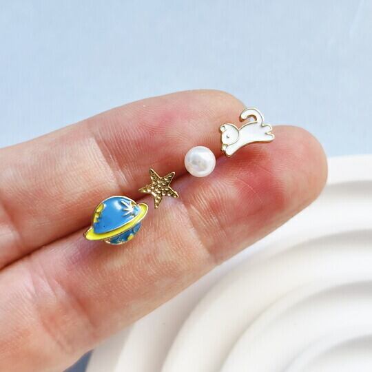 ■宇宙の神秘を感じる楽しいピアスセット!「Terse 楽しい宇宙旅行ピアス☆日替わりで楽しめるお得なセット」は、うさぎ、惑星、土星、星、夜空のモチーフが揃った魅力的なデザインが特徴です。パールや真珠のような輝きが加わり、ファッションに華やかさをプラスすること間違いなしです!その日の気分に合わせて、異なるデザインを楽しんでみてください。