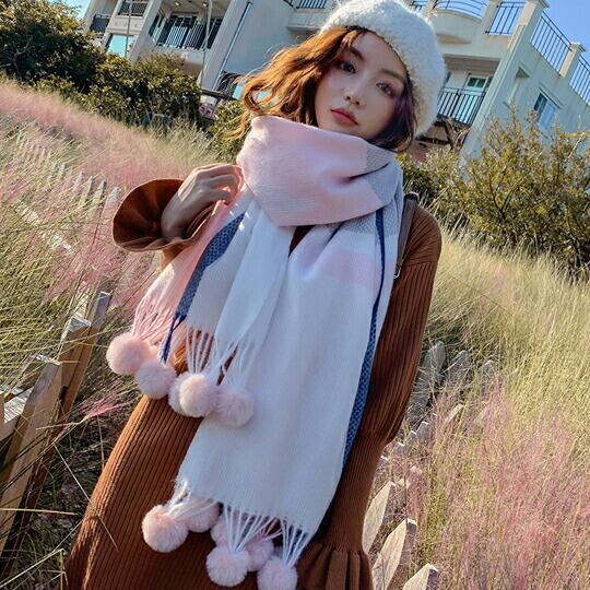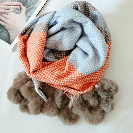 首周りが華やぐふわふわのポンポン付きチェック柄マフラー アクリル素材でふっくらと厚みがありながら、軽くてソフトな着け心地 大きめのポンポンがコーディネートのアクセントになり 使いやすいシンプルな配色 ma0128a 秋冬マフラー